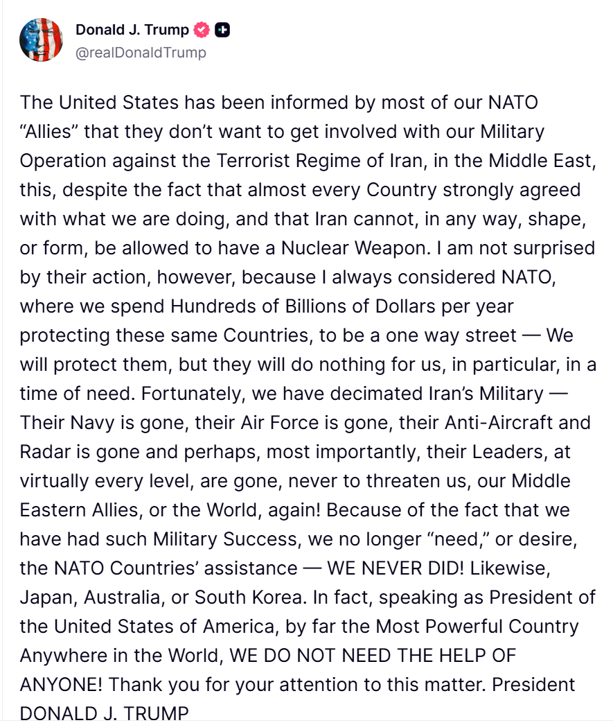 特朗普在其酬酢平台“真确酬酢”发文称,好意思国已收到大多半北约“盟友”的奉告,称他们不肯卷入好意思国在中东针对伊朗发起的军事步履。特朗普称,他并不感到只怕——因为他一直以为,北约本体上是一条“单行说念”:好意思国会保护他们,但他们却不会为好意思国作念任何事,尤其是在好意思国有求于他们的本领。