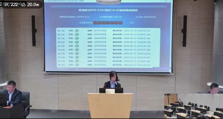 3月13日,上海首批相接出让的住宅地块参加现场竞价措施。青浦区QPPO-0101单位18-05地块眩惑两位竞买东说念主参与竞拍,历程33轮竞价,绿城中国(03900.HK)旗下的上海致祐置业有限公司以26.75亿元的总价竞得,未触及32.63亿元的中止价,溢价率为6.57%,成交楼板价为31972元/平方米。